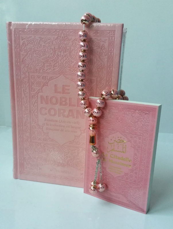 Pack cadeau coranique Rose : Le Saint Coran Rainbow Bilingue (aux couleurs Arc-en-ciel) + La Citadelle du Musulman (français/arabe/phonétique) + Chapelet - REF. 24070 (29.90 €)