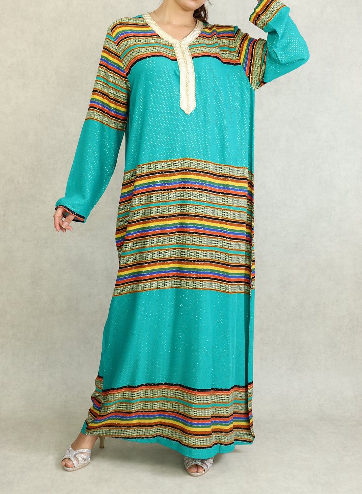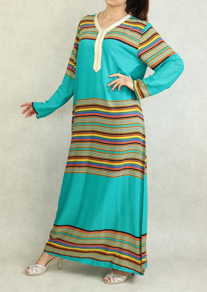 Robe orientale manches longues à paillettes brillantes. Avec rayures horizontales multi-Couleurs. Coupe droite, col V. On aime son tissu au toucher et un tombé fluide et confortable. Agréable robe d'été et toutes saisons pour la maison.