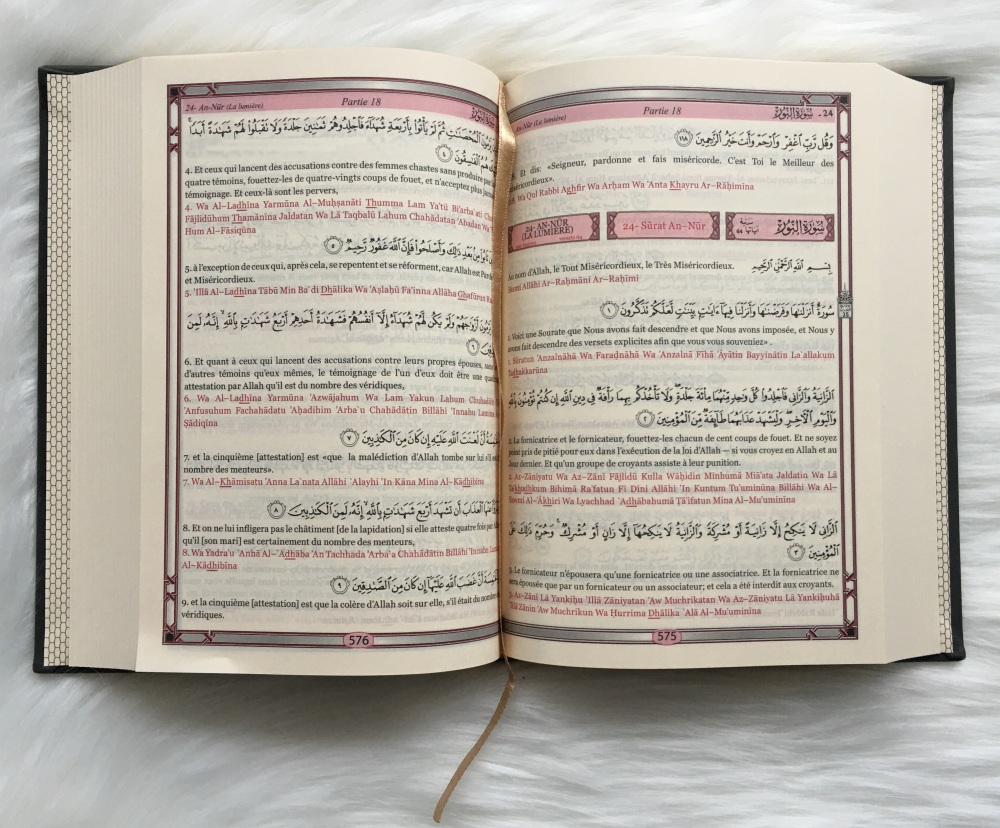 Le saint Coran avec versets en arabe, traduction française + transcription phonétique (translittération de l'arabe en caractères latins). Impression couleur, avec marque page intégré.