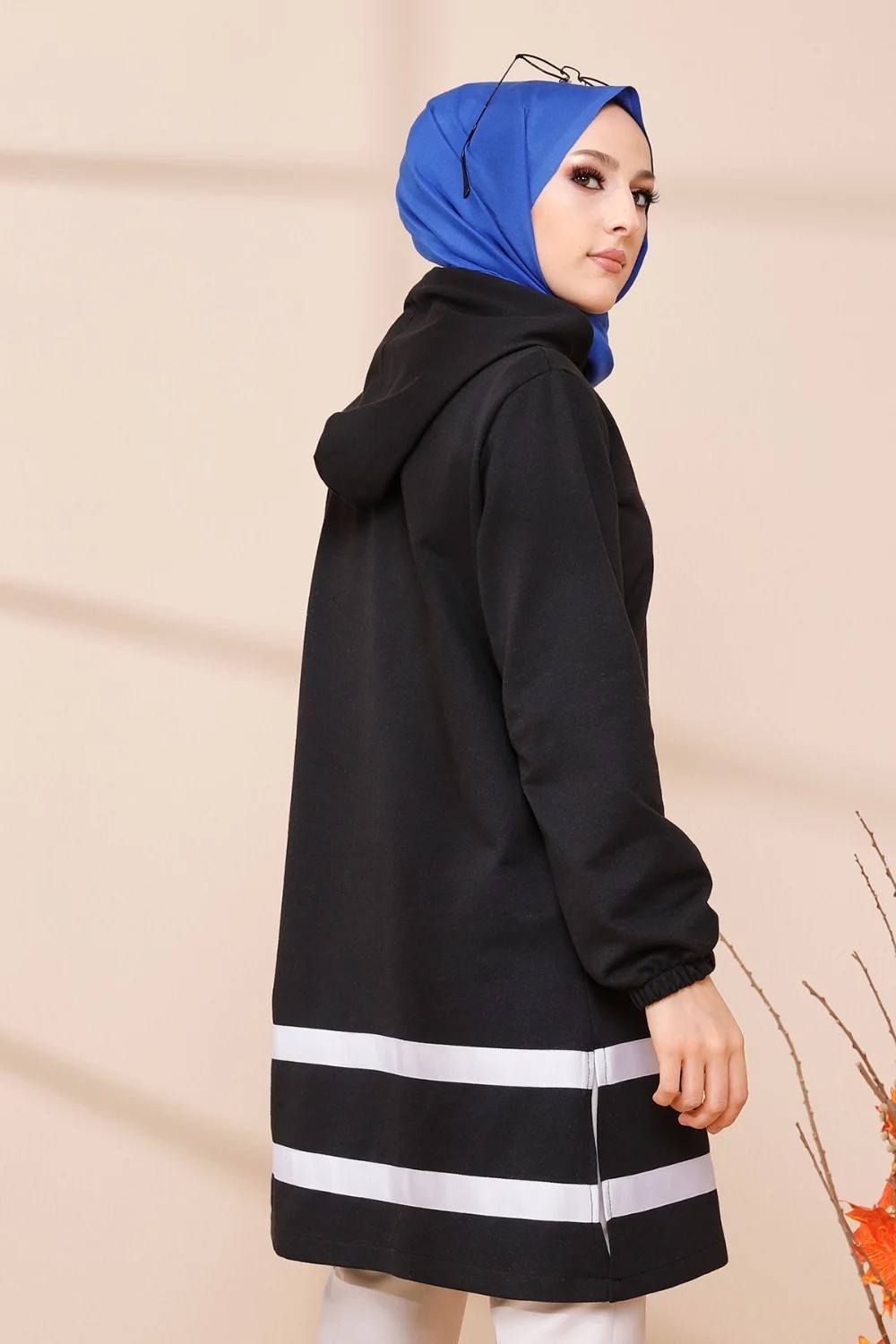 Tunique a capuche et bandes noires pour femme (Mode musulmane) - Couleur noir