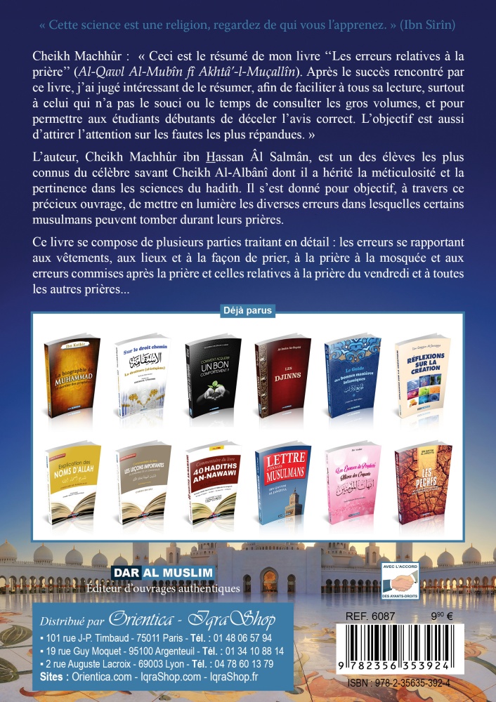 Cheikh Machhûr ibn Hasan Âl Salmân : « Ceci est le résumé de mon livre ‘‘Les erreurs relatives à la prière’’ (Al-Qawl Al-Mubîn fî Akhtâ’-l-Muçallîn). Après le succès rencontré par ce livre, j’ai jugé intéressant de le résumer, afin de faciliter à tous sa lecture, surtout à celui qui n’a pas le souci ou le temps de consulter les gros volumes, et pour permettre aux étudiants débutants de déceler l’avis correct. L’objectif est aussi d’attirer l’attention sur les fautes les plus répandues. »