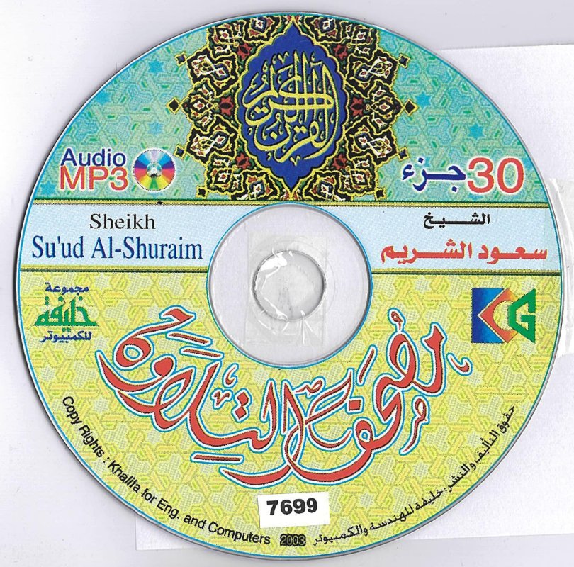Une psalmodie du Saint Coran par Cheikh Saoud Shureim en lecture Hafs (CD MP3).