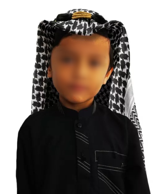 Foulard avec son Agal (noir doré qu'on pose sur la tête), voir photo. Taille standard pour enfant.