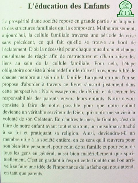 La prospérité et l'équilibre d'une société repose en grande partie sur la qualité des structures familiales. Or, de nos jours ces derniéres sont en crise. D'ou la nécessité pour chaque musulman de ré-harmoniser la cellule familiale. Pour cela il faut appréhender un point important : la responsabilité de chacun au sein de la famille. Ce livret s'inscrit justement dans cette perspective afin que l'enfant soit attaché à sa religion, utile à la société, et porteur de bien être pour soi-même, sa famille, et son entourage.Cette finalité met en exergue l'importance de la tâche des parents.
