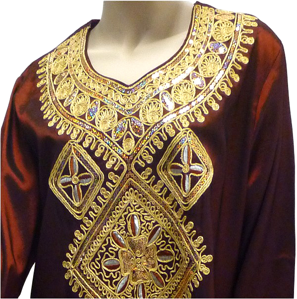 Robe de soirée couleur marron avec broderies dorées sur le devant et les manches. Tissu épais et satiné.