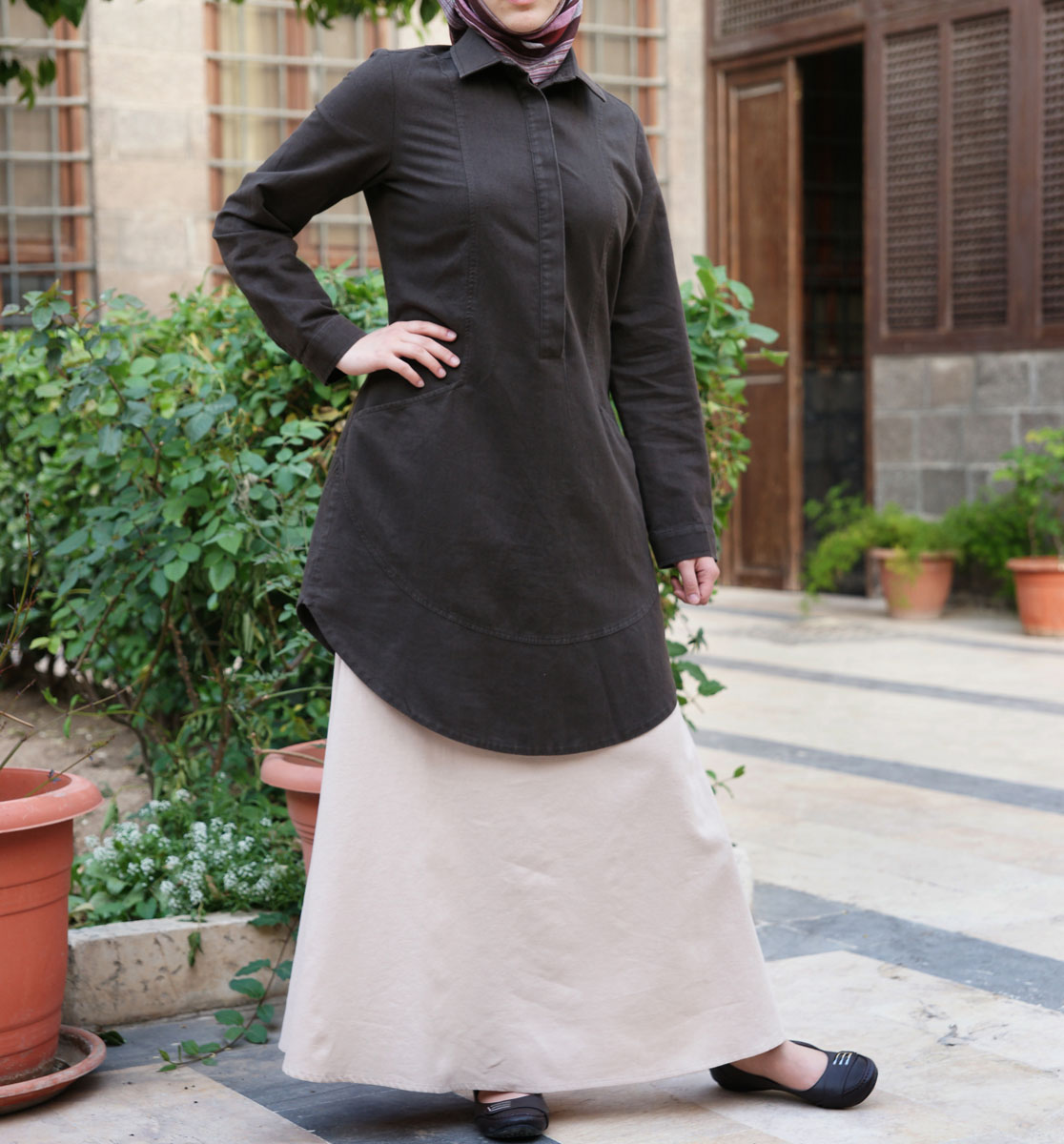 Description : Longueur au genou à l'avant, et à mi-cuisse sur les côtés ; col pointu ; boutonnage cachée à la taille ; poignets boutonnés ; large ourlet incurvé.