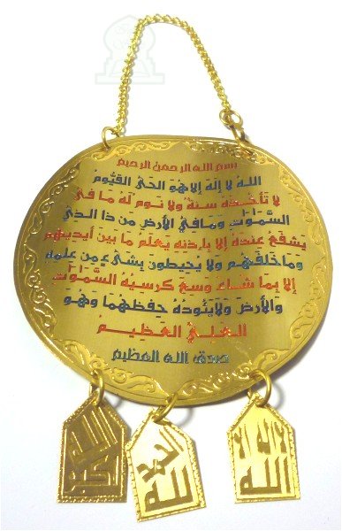 Pendentif rond métallique doré avec l'inscription du "Verset du trône" (Ayat Al-Kursî).