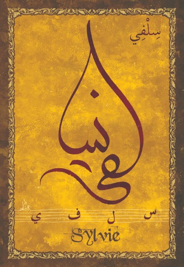 Jolie carte postale représentant le prénom français Sylvie calligraphié en arabe ainsi que son épellation lettre par lettre en arabe. Derrière la carte postale se trouve la signification du prénom. Prénom d'origine latine signifiant forêt.