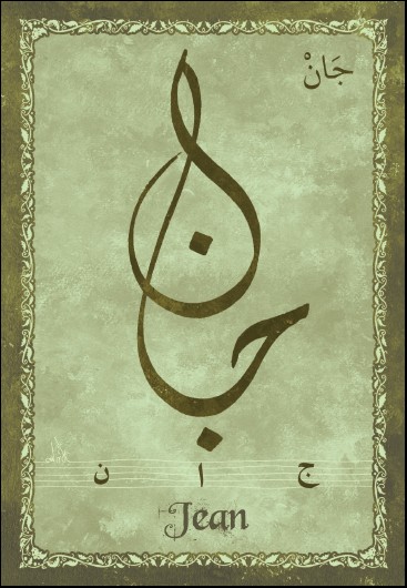 Jolie carte postale représentant le prénom français Jean calligraphié en arabe ainsi que son épellation lettre par lettre en arabe. Derrière la carte postale se trouve la signification du prénom. Prénom d'origine hébreu signifiant Dieu a fait sa grâce.