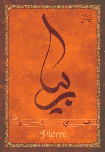Jolie carte postale représentant le prénom français Pierre calligraphié en arabe ainsi que son épellation lettre par lettre en arabe. Derrière la carte postale se trouve la signification du prénom. Prénom d'origine latine signifiant la pierre.
