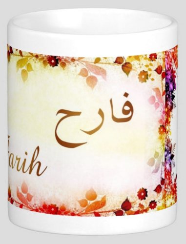 Mug avec le prénom "Farih" écrit en français, en arabe (فارح) et calligraphié de façon artistique en arabe sur la partie droite.