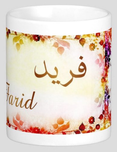 Mug avec le prénom "Farid" écrit en français, en arabe (فريد) et calligraphié de façon artistique en arabe sur la partie droite.