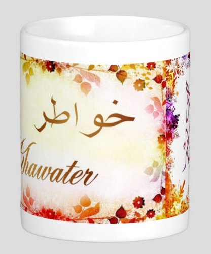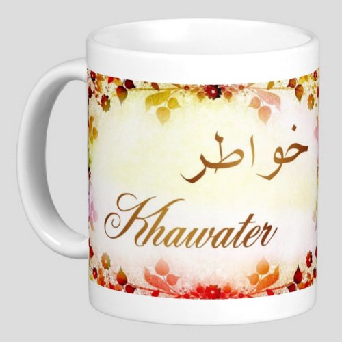 Mug avec le prénom "Khawater" écrit en français, en arabe (خواطر) et calligraphié de façon artistique en arabe sur la partie droite.