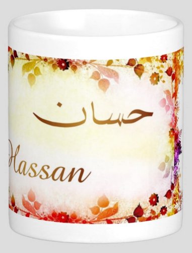 Mug avec le prénom "Hassan" écrit en français, en arabe (حسان) et calligraphié de façon artistique en arabe sur la partie droite.