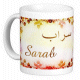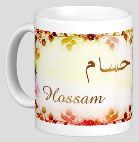 Mug avec le prénom "Hossam" écrit en français, en arabe (حسام) et calligraphié de façon artistique en arabe sur la partie droite.