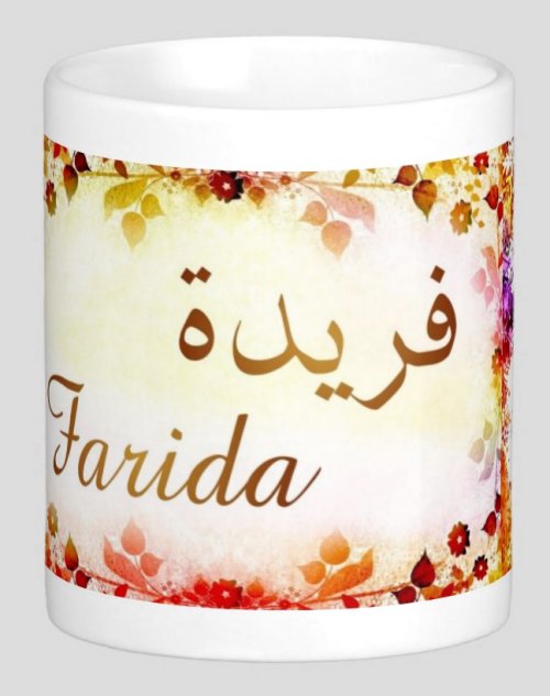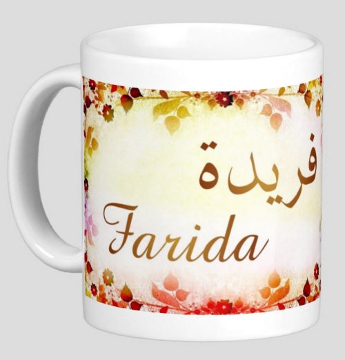 Mug avec le prénom "Farida" écrit en français, en arabe (فريدة) et calligraphié de façon artistique en arabe sur la partie droite.