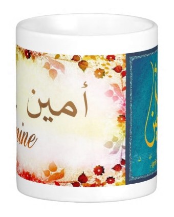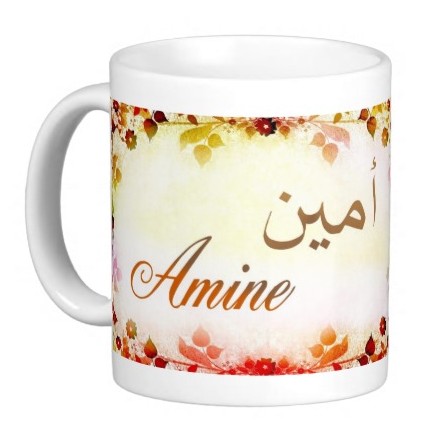 Mug avec le prénom Amine calligraphié en arabe (امين) ainsi que son épellation lettre par lettre en arabe.