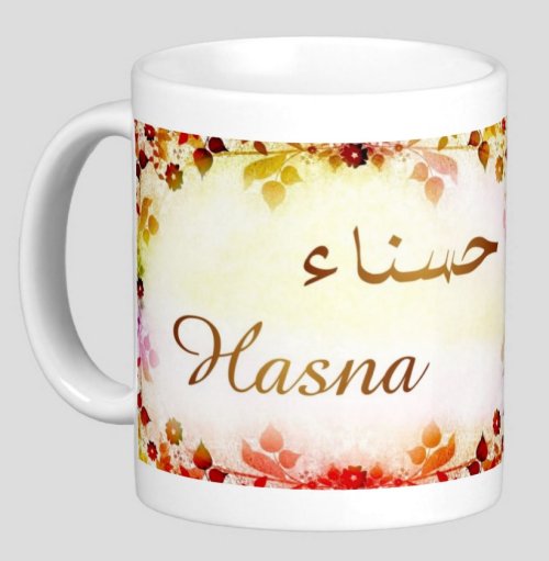 Mug avec le prénom "Hasna" écrit en français, en arabe (حسنة) et calligraphié de façon artistique en arabe sur la partie droite.