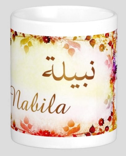 Mug avec le prénom "Nabila" écrit en français, en arabe (نبيلة) et calligraphié de façon artistique en arabe sur la partie droite.