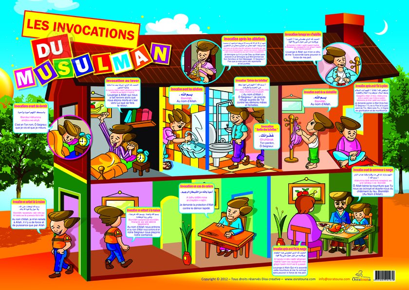 Désormais, votre enfant sera un bon musulman, et connaîtra parfaitement les invocations quotidiennes qui accompagneront ses gestes au jour le jour, grâce à ce poster très ludique, riche en couleurs, avec des annotations claires, et enfin, très bien illustré... Il aura la chance d'apprendre les dou'â' ou prières ainsi que l'occasion de son énonciation.