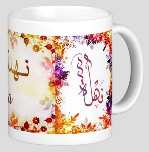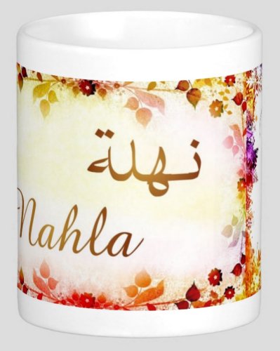 Mug avec le prénom "Nahla" écrit en français, en arabe (نَهْلَة) et calligraphié de façon artistique en arabe sur la partie droite.