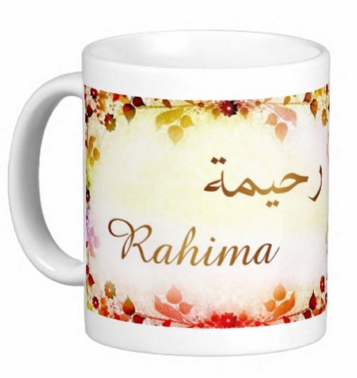 Mug avec le prénom "Rahima" écrit en français, en arabe (رحيمة) et calligraphié de façon artistique en arabe sur la partie droite.