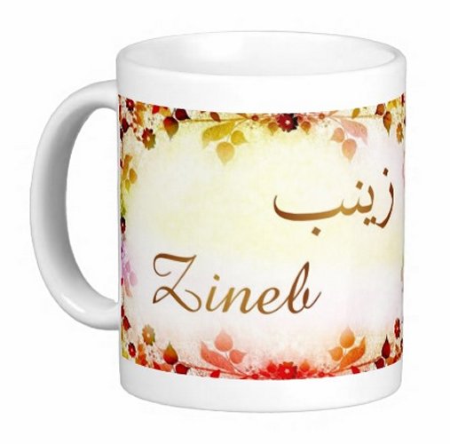 Mug avec le prénom "Zineb" écrit en français, en arabe (زينب) et calligraphié de façon artistique en arabe sur la partie droite.