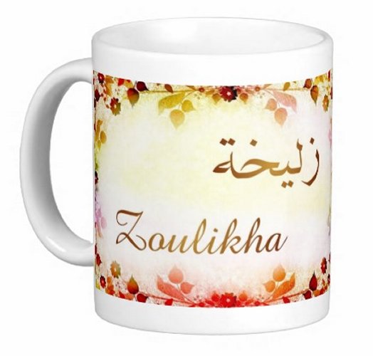 Mug avec le prénom "Zoulikha" écrit en français, en arabe (زليخة) et calligraphié de façon artistique en arabe sur la partie droite.