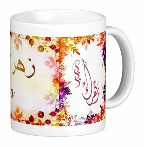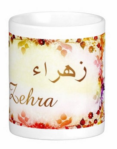 Mug avec le prénom "Zehra" écrit en français, en arabe (زهرة) et calligraphié de façon artistique en arabe sur la partie droite.