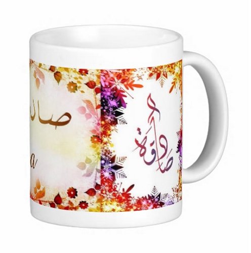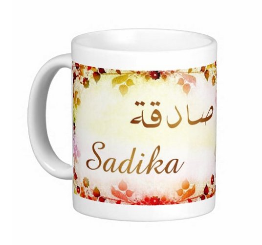 Mug avec le prénom "Sadika" écrit en français, en arabe (صادقة) et calligraphié de façon artistique en arabe sur la partie droite.