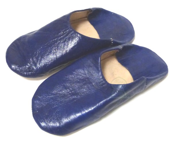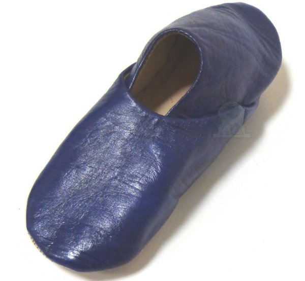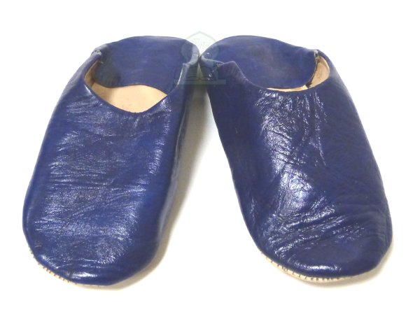 Jolie babouche traditionnelle marocaine pour enfants / garçons, de fabrication artisanale, faite de cuir (composition cuir) couleur bleue marine, très confortable au pieds.