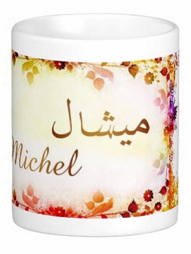 Mug avec le prénom "Michel" écrit en français, en arabe (ميشال) et calligraphié de façon artistique en arabe sur la partie droite.