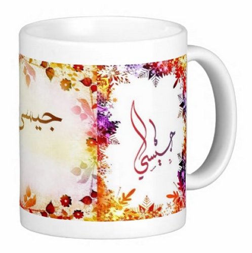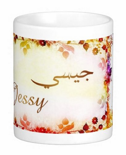 Mug avec le prénom "Jessy" écrit en français, en arabe (جيسي) et calligraphié de façon artistique en arabe sur la partie droite.
