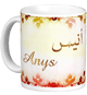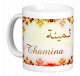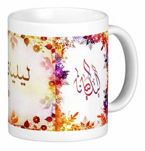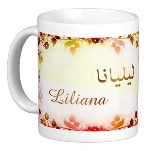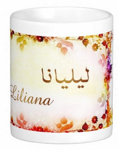 Mug avec le prénom "Lilianna" écrit en français, en arabe (ليليانا) et calligraphié de façon artistique en arabe sur la partie droite.