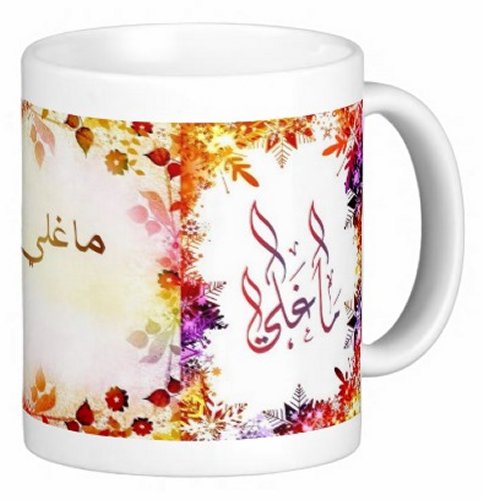 Mug avec le prénom "Magali" écrit en français, en arabe (ماغلي) et calligraphié de façon artistique en arabe sur la partie droite.