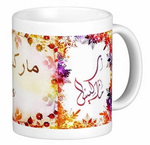 Mug avec le prénom "Marcus" écrit en français, en arabe (ماركس) et calligraphié de façon artistique en arabe sur la partie droite.