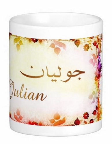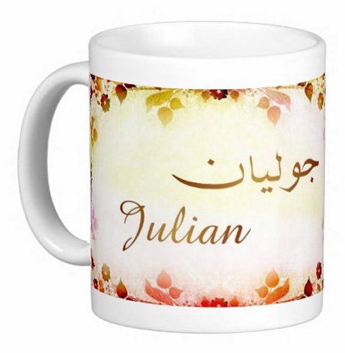 Mug avec le prénom "Julien" écrit en français, en arabe (جوليان) et calligraphié de façon artistique en arabe sur la partie droite.