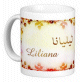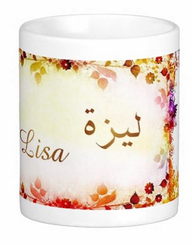 Mug avec le prénom "Lisa" écrit en français, en arabe (ليزة) et calligraphié de façon artistique en arabe sur la partie droite.