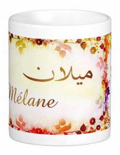 Mug avec le prénom "Mélane" écrit en français, en arabe (ميلان) et calligraphié de façon artistique en arabe sur la partie droite.