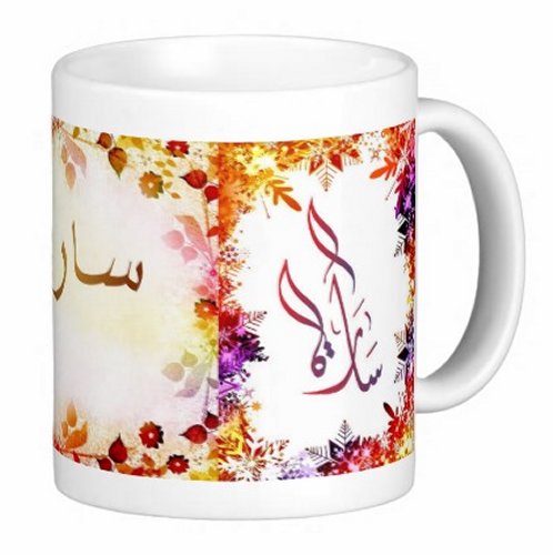 Mug avec le prénom "Sara" écrit en français, en arabe (سارة) et calligraphié de façon artistique en arabe sur la partie droite.