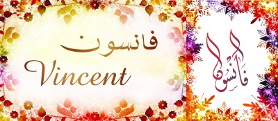Mug avec le prénom "Vincent" écrit en français, en arabe (فانسون) et calligraphié de façon artistique en arabe sur la partie droite.