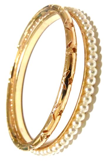 Ensemble constitué de 2 bracelet en métal doré garni d'une bande de perles ovales de couleur blanche 1 étoilé.