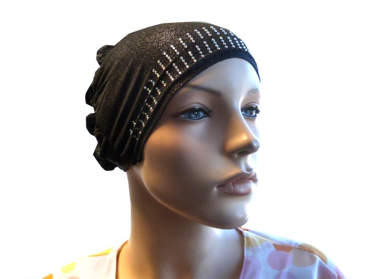 Bonnet noir pailleté avec strass sur le devant ainsi que sur la coiffe.