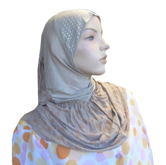 Hijab 1 pièce taupe perlé sur le bonnet avec motifs cuivrés.