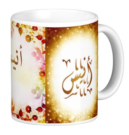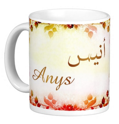 Mug avec le prénom "Anys" écrit en français, en arabe (أنيس) et calligraphié de façon artistique en arabe sur la partie droite.
