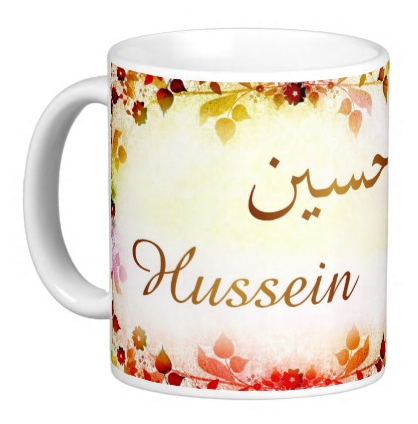 Mug avec le prénom "Hussein" écrit en français, en arabe (حسين) et calligraphié de façon artistique en arabe sur la partie droite.