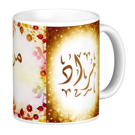 Mug avec le prénom "Morad" écrit en français, en arabe (مراد) et calligraphié de façon artistique en arabe sur la partie droite.