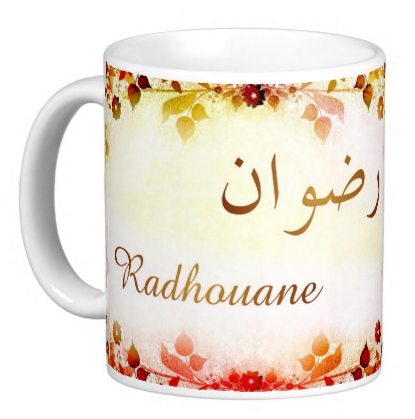 Mug avec le prénom "Radhouane" écrit en français, en arabe (رضوان) et calligraphié de façon artistique en arabe sur la partie droite.