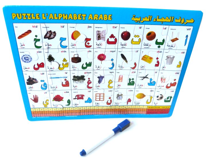 Sur une face, un puzzle de 28 pièces avec l'alphabet arabe, sur l'autre face, une ardoise avec feutre effaçable (utilisable à volonté).