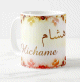Mug avec le prénom "Moustapha" écrit en français, en arabe (مصطفى) et calligraphié de façon artistique en arabe sur la partie droite.